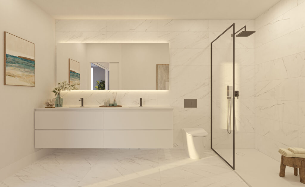 1. Minimalist Style and Maximum Functionality: This aims to prioritise simplicity, clean lines, and a neutral colour palette. The goal is to create open and relaxing spaces where each element has a clear function. Wall-mounted furniture, integrated sinks, and the use of materials like polished cement or matte ceramic fall within this elegant and modern style.